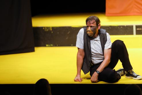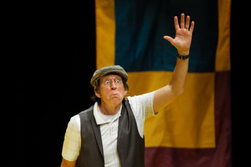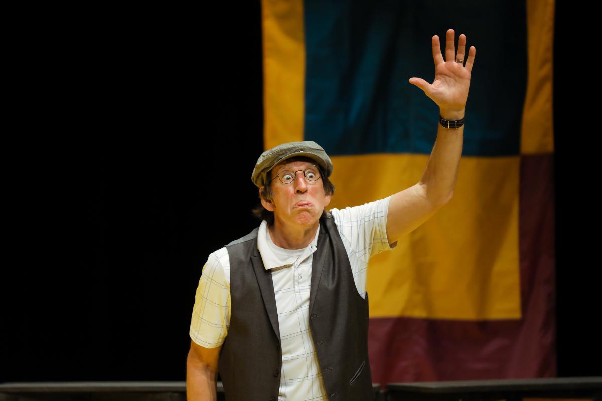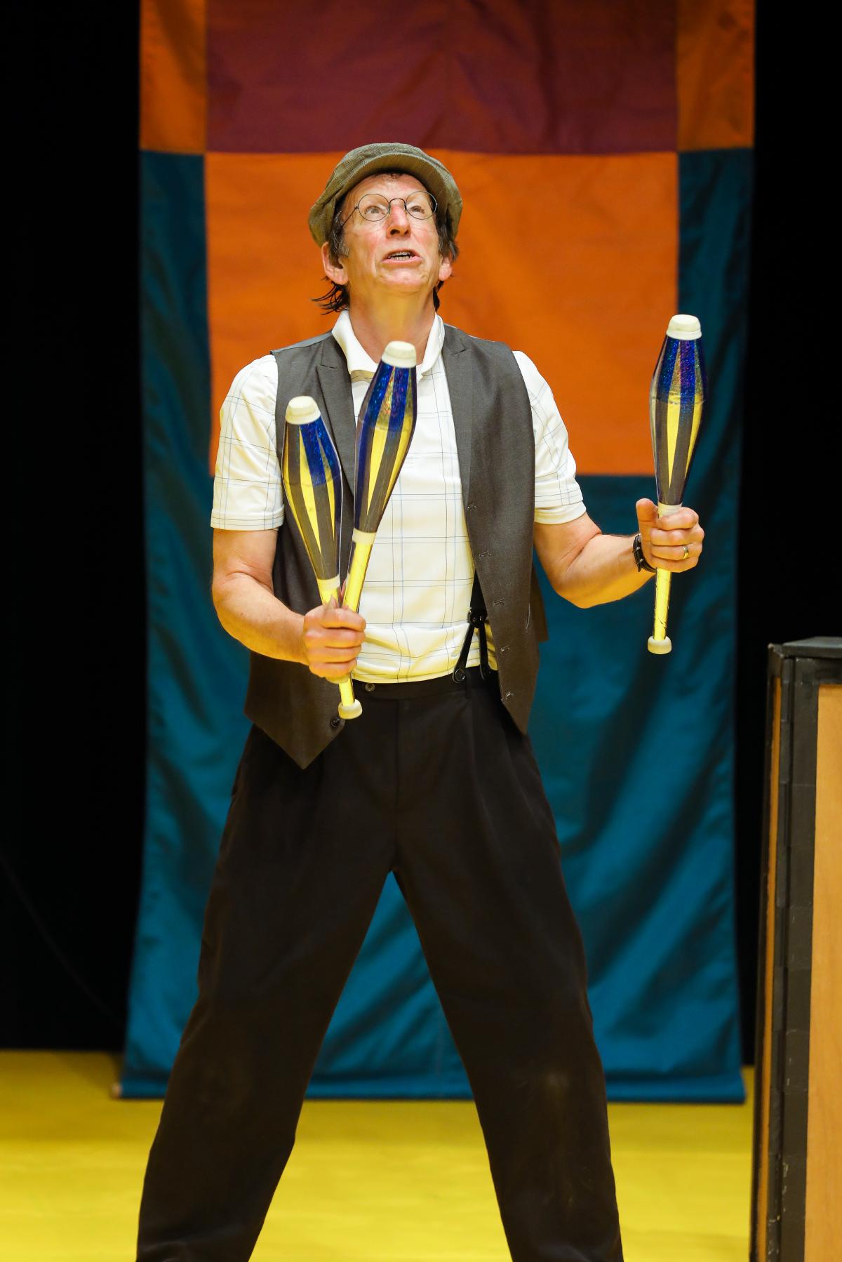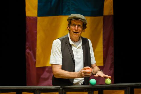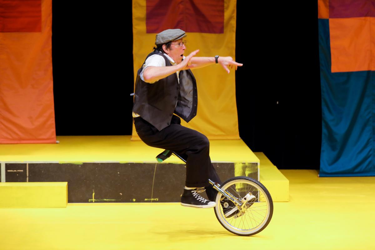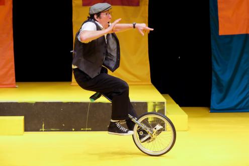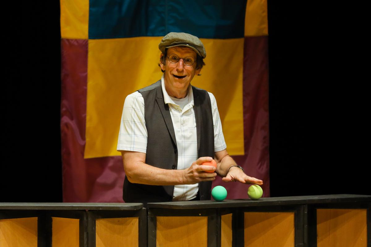 “No Show” begins with the premise that a performance has been scheduled, the stage is set with props and costumes, the audience has gathered and is seated and waiting, but the actors are a no show. What might happen when someone from the audience aproaches the stage and discovers all that awaits. Masterfull mayhem? Perhaps. Imagine one’s first attempt at riding a unicycle, the discovery of theatrical masks, juggling clubs, and a sousaphone. Can one really keep rhythm juggling shakers while playing classical music on harmonica?